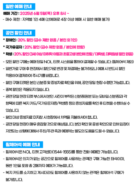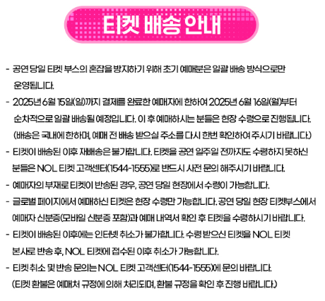 - 예매 개시일: 2025년 6월 오후 8시 (각 지역별 정식 공지 전 2개월)